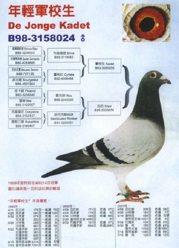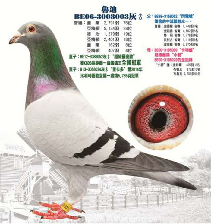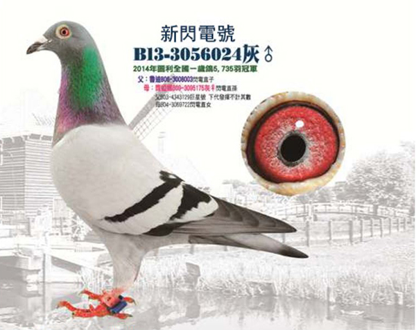同父半弟: B13-3056024”新閃電”入賞2014年圖利一歲鴿5.735羽全國1位) ▼曾祖父:B06-3008003 “魯迪” ▼曾曾祖父:B98-3158062 “閃電號” ▼外曾祖父:B98-3158024 “年輕軍校生(Jonge Kadet)