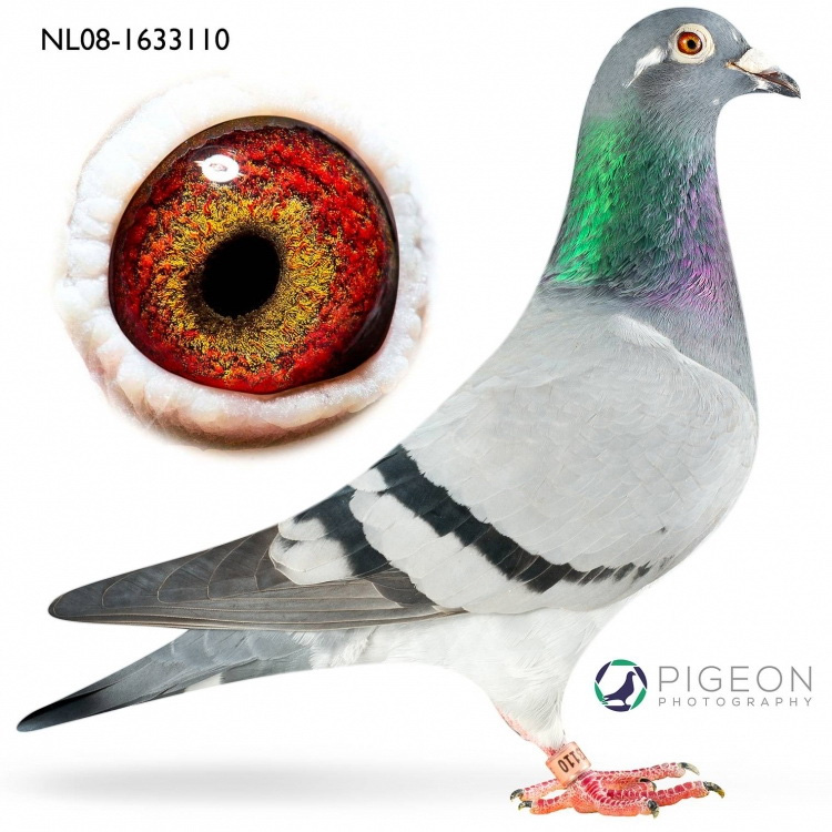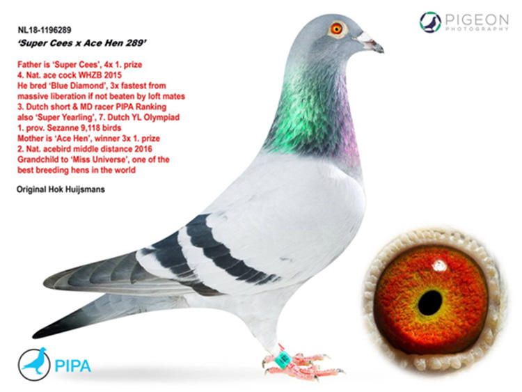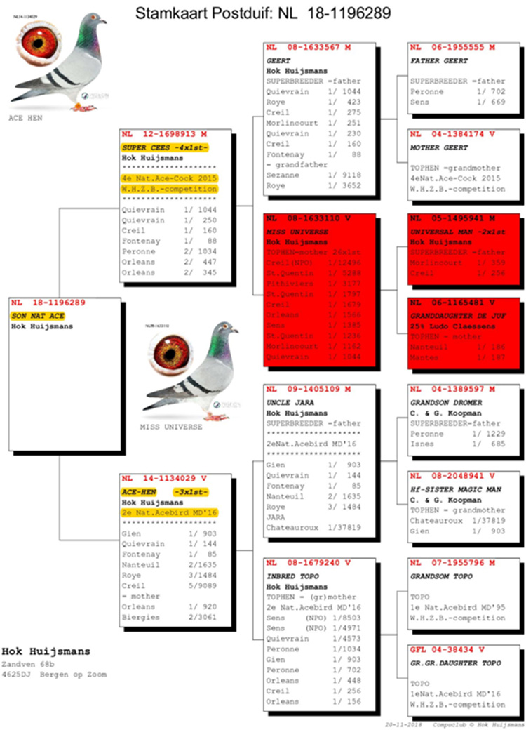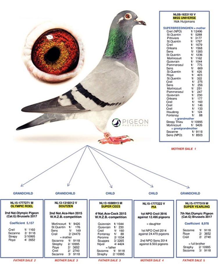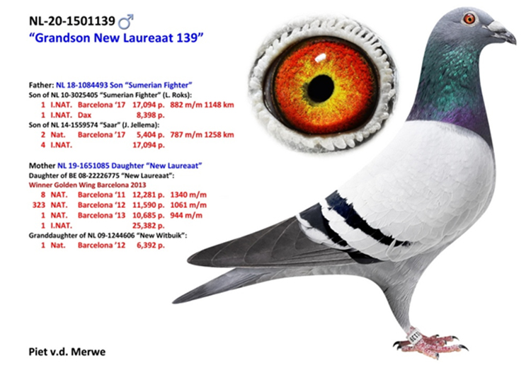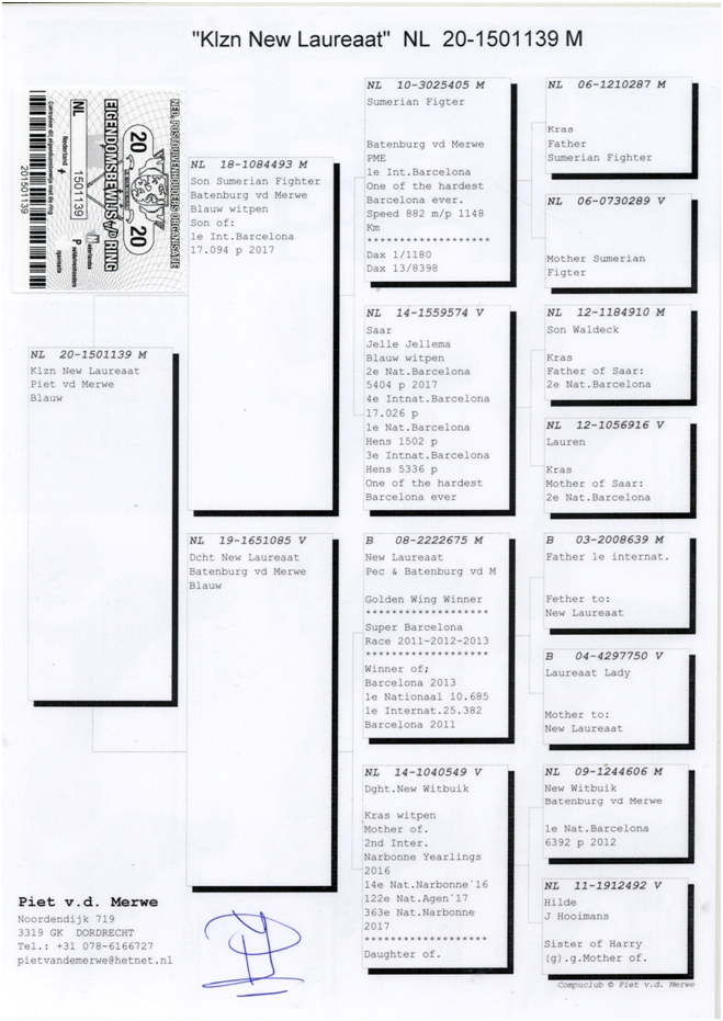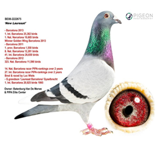 外祖母鴿:NL14-1040549斑白羽.母,為2012年巴賽隆納荷蘭全國6.392羽冠軍、國際25.320羽6位“新白腹號直女” –雨果‧巴滕柏格原舍作出。