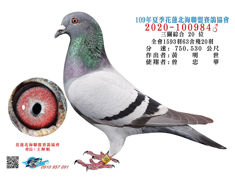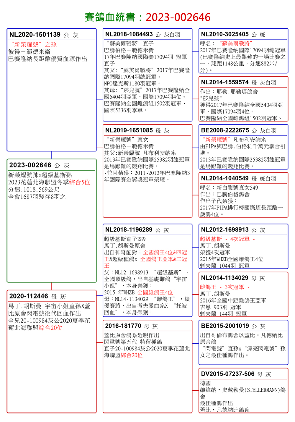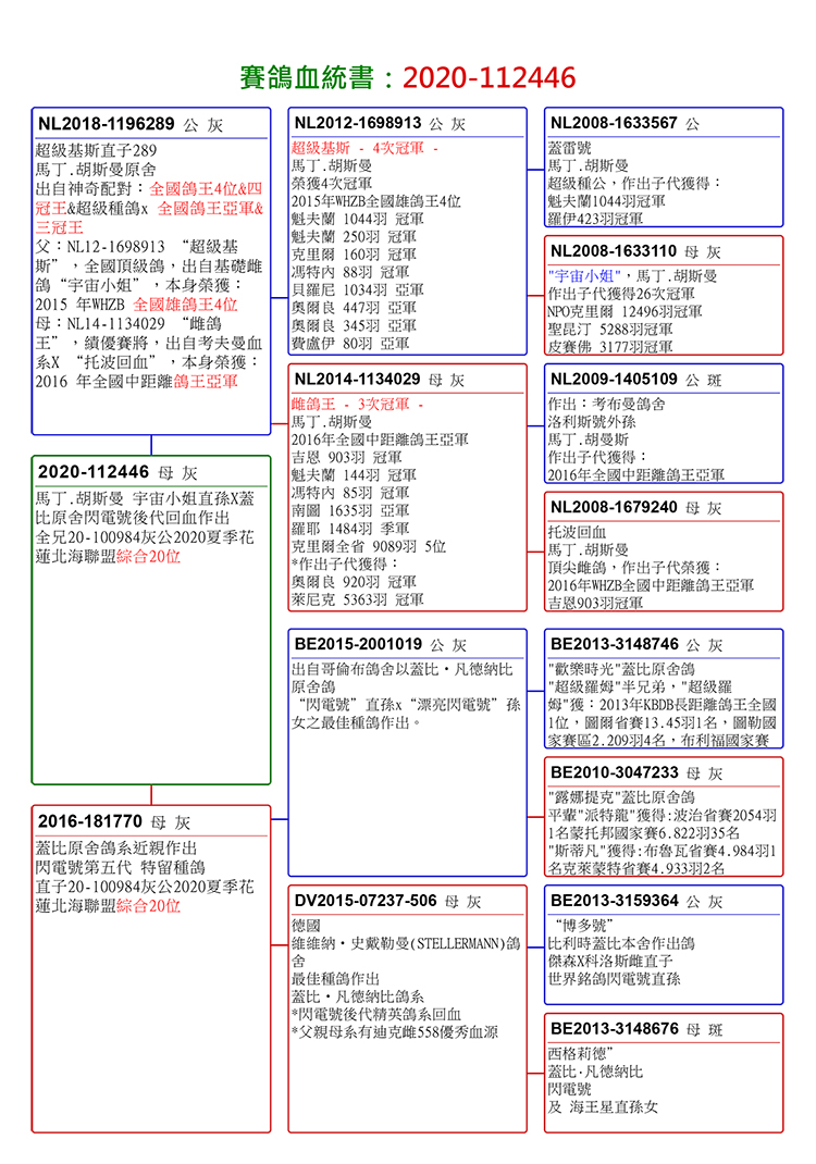 母鴿:20-112446 灰 馬丁.胡斯曼 宇宙小姐直孫X蓋比原舍閃電號後代回血作出 (全兄20-100984灰公2020夏季花蓮北海聯盟綜合20位 )