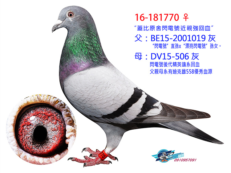 直孫NL15-1689175班白羽.母,入賞2016年拿邦國際賽一歲鴿7.811羽8位。