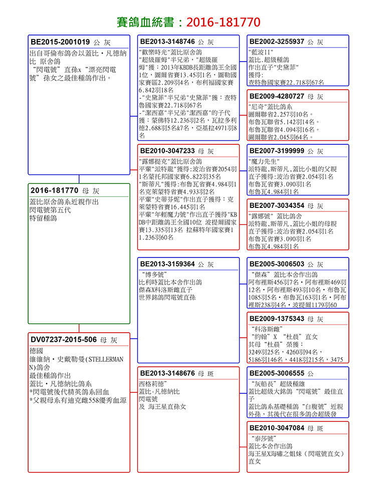 祖母鴿:NL14-1559574灰白羽.母.“莎兒”, 荷蘭長距離強豪耶勒.耶勒瑪獲得2017年巴塞隆納國際賽17.094羽4位。