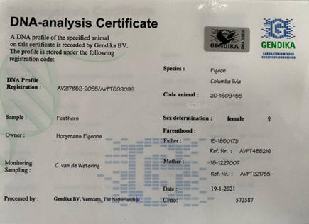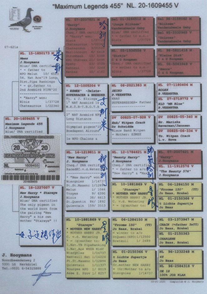 父鴿:“米斯” NL15-1850173 灰公,子代榮獲: NPO 莫倫 6,025羽10名。“哈利” (NL07-2007621) x “艾斯米NL12-1005204” (2014年WHZB/王中王鴿王全國1位 – 奧林匹克鴿王,艾辛加使翔) 直子。 母鴿:“NL18-1227007” 灰母.(世界上唯一的1羽出自“新哈利”X他自己的母親“星眼”的直女)。 DNA檢驗證書。 世界銘鴿 “哈利”直孫女。 新基礎種鴿“新哈利”直孫女。 鴿王全國1位“艾斯米” (艾辛加 )的直孫女。 “星眼” (“新哈利”之母) 直孫女。 父鴿:“米斯” NL15-1850173 灰公 子代榮獲: NPO 莫倫 6,025羽10名。 “哈利” (NL07-2007621) x “艾斯米” (2014年WHZB/王中王鴿王全國1位 – 布達佩斯奧林匹克鴿王,艾辛加使翔) 直子。 母鴿:“NL18-1227007” 灰母. (世界上唯一一羽出自“新哈利”X他自己的母親“星眼”的直女)。 其父“新哈利”榮獲: 尼爾吉尼省賽 14,737羽1名。 龐特省賽 12,894羽1名。 莫倫 1,046羽1名。 NPO 特洛伊 6,390羽9名,範德威特靈使翔。 “新哈利”的子孫代榮獲: NPO 和省賽或鴿王21 次1名。 ![]() “新哈利唯一455” NL20-1609455灰母 D.N.A.檢驗證明書 ![]() ![]() ![]() “新哈利唯一455” NL20-1609455灰母 血統書 ![]() “新哈利唯一455” NL20-1609455灰母 中文翻譯血統書 連絡人:黃慶勳 電話:0922-591037 加line:0922591037 |