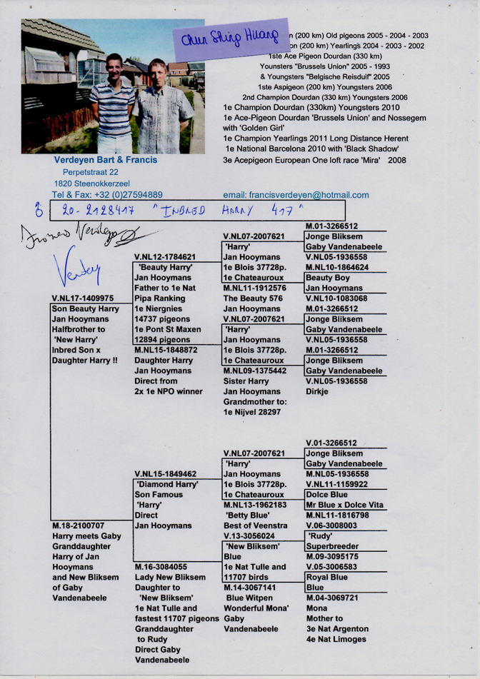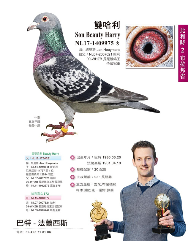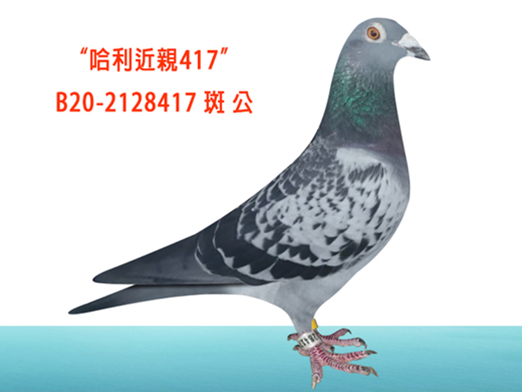B20-2128417 班 公”哈利近親417”,比利時巴特父子鴿舍作出,(帥氣哈利直子X 鑽石哈利直女)黃金血源作出,中型,修長身,骨架堅硬,95分。