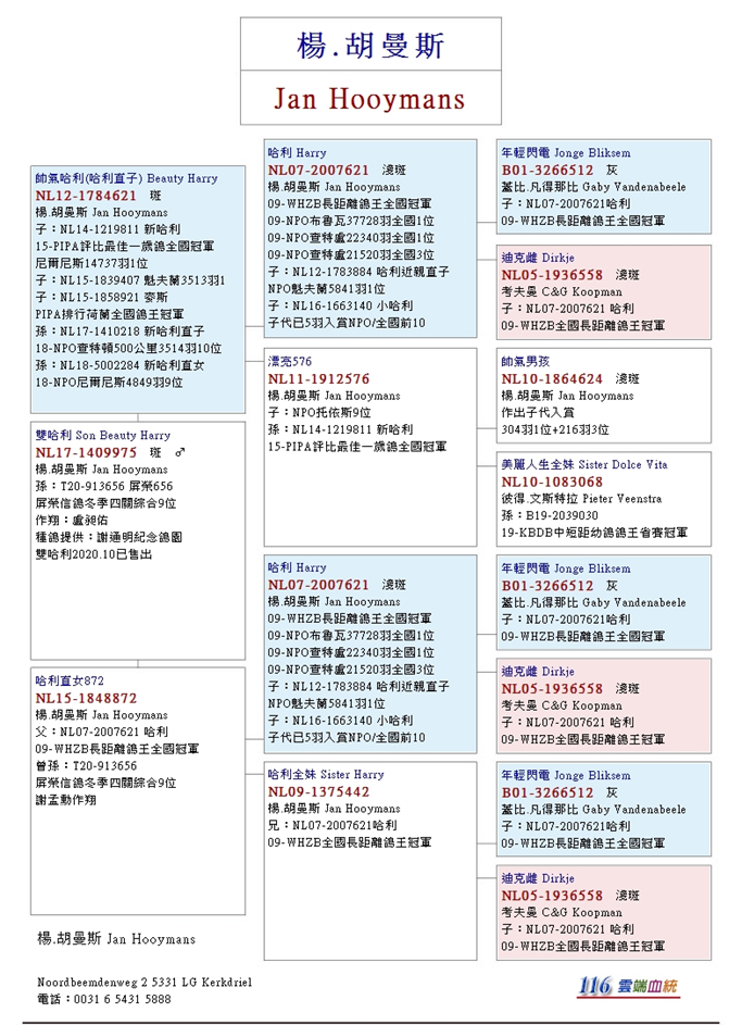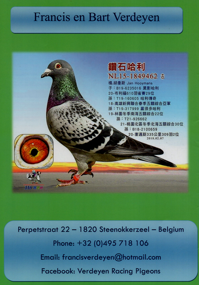 父鴿:NL17-1409975班公”雙哈利”,是“帥氣哈利NL12-1784621直子”, 帥氣哈利就是大名鼎鼎”新哈利”的 父親。孫20-913656獲得屏榮信鴿冬季四關綜合9位。 母鴿:NL18-2100707班母,”鑽石哈利NL15-1849462直女” 即楊.胡曼斯鴿舍”哈利”直子。 ![]() ![]() ![]() 父鴿:NL17-1409975班公,“帥氣哈利NL12-1784621直子”, 帥氣哈利就是大名鼎鼎”新哈利”的 父親。 ![]() ![]() 連絡人:黃慶勳 電話:0922-591037 加line:0922591037 |