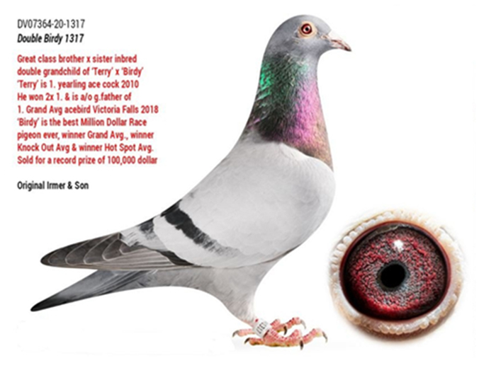 世界名鴿:DV06503-07-900 灰母 “伯蒂號” 描述: 超級血系鴿,出自兄妹近親配對:父母均出自“泰瑞”X“伯蒂” - - x - - x - x - - x - - x - - x - - x - - x - - x - - x - - x - - x - - x - - x - - x - - x - - x - - x - ▲本拍賣鴿出自“伯蒂”的直子X“美麗伯蒂”,父母均出自“伯蒂”X“泰瑞” ●祖父&外祖父:DV06503-08-156 “泰瑞”,出自“薩克森”X“喬丹”, 本身榮獲: 2010年一歲雄鴿王冠軍。 一歲鴿參賽2次冠軍。 皮賽佛2,708羽冠軍。 聯合會9,858羽亞軍。 —作育子代TRPF-11-21447獲得: 米德堡地區亞軍(僅落後同舍鴿)/聯盟1,841羽5位(640公里)。 里士滿地區8位/聯盟1,879羽32位(700公里)。 還入賞地區12.-14.-18.-21位& 聯盟18.-21.-32.-68位。 —“泰瑞”的孫代“西班牙小姐”獲得: 2018年維多利亞瀑布大綜合鴿王冠軍。 2018年維多利亞瀑布決賽12位。 —“泰瑞”的其他孫代代表: 1.“小星星”(基全布蘭德團隊)獲得: 2011年聯盟最佳幼鴿賽雌。 2011年團隊賽最佳幼鴿賽雌排名4位。 入賞名次:5.-13.-14.-28.-55位。 2.“超級818號”: 1.-2.-5.-6.-7.-8.-9位。 ●祖母&外祖母:DV06503-07-900 “伯蒂”,百萬美金大獎賽有史以來最佳賽將, 榮獲: 南非太陽城百萬美元公棚大賽史上最優秀的賽將。 2008年太陽城百萬美元公棚大賽陶汰賽綜合冠軍。 2008年太陽城百萬美元公棚大賽大綜合冠軍。 2008年太陽城百萬美元公棚大賽熱點賽綜合冠軍。 “伯蒂”最終以100,000美元的紀錄價被售出。 —.“伯蒂”血系在歐洲獲得佳績包括: 德國鴿王冠軍&全國雄鴿王20位(伯蒂的祖父)。 2004年RV全省全能鴿王冠軍(伯蒂的父親)。 2002年RV一歲鴿王冠軍(伯蒂的半兄弟)。 “伯蒂”首批做出的6羽直子代都作出了冠軍子代,包括公棚賽汽車大獎得主! 4羽子代入賞2011年南非百萬美金大獎賽前200位(出自伯蒂超級直子“猛虎號”)。 2羽子代入賞2011年南非百萬美金大獎賽前200位(出自伯蒂超級直子“猛虎號”)。 2013年“CCF年度鴿王”澳大利亞全國最佳賽將(皮特.馬迪科使翔)(伯蒂血系鴿)。 “雷納2號”獲:2012年南非太陽城百萬美元國際公棚大賽總決賽4位(布蘭帝團隊使翔)(伯蒂姐妹864號孫代)。 2013年惠翔公棚賽歐洲鴿冠軍/國際鴿王7位(克勞斯.伍斯特菲爾德使翔)(伯蒂姐妹864號孫代)。 2011年波提爾全國9,325羽冠軍(出自伯蒂姐妹863號)。 2013年倫敦全國季軍&2012年倫敦全國11位(出自伯蒂姐妹863號)。 2011年聯盟最佳幼鴿賽雌(出自伯蒂姐妹863號)。 多羽幼鴿獲得冠軍獎項(出自伯蒂最後全妹“露貝”)。 2011年全國大賽最優秀賽鴿(“馬克”-出自伯蒂姐妹200號)。 2011年波治全國13,673羽32位(“馬克”-出自伯蒂姐妹200號)。 2011年波提爾全國9,325羽35位(“馬克”-出自伯蒂姐妹200號)。 2010年聯盟幼鴿鴿王冠軍(“馬克”-出自伯蒂姐妹200號)。 連絡人:黃慶勳 電話:0922-591037 加line:0922591037 |
